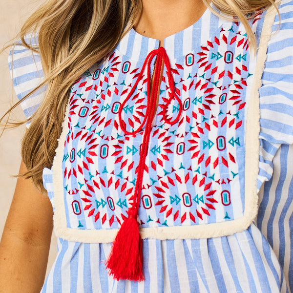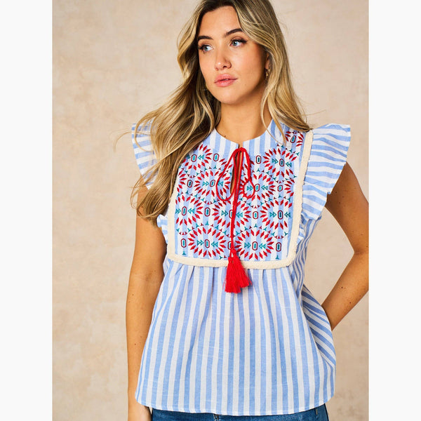 Embroidered Striped Ruffle Sleeve Cotton Shirt in Blue: Small (UK 8-10)